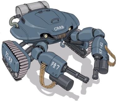 Quand le CRAB 7.0 lance un objet offensif ou incapacitant, il doit obtenir 1, ou 2 sur un 1D6 pour toucher son adversaire. Son armure